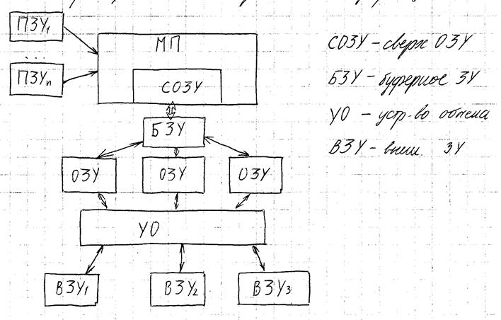 СОЗУ – быстродействие соизмеримо с быстродействием МП. Объем – необходимый для выполнения некот. Текущей последовательности команд программы. ОЗУ –Быстродействие на порядок хуже чем у СОЗУ ВЗУ – для хранения информации, быстродействие еще ниже. БЗУ – для промежуточн хранения информации между устройствами памяти с разными скоросятями. ПЗУ- для постоянного хранения информации