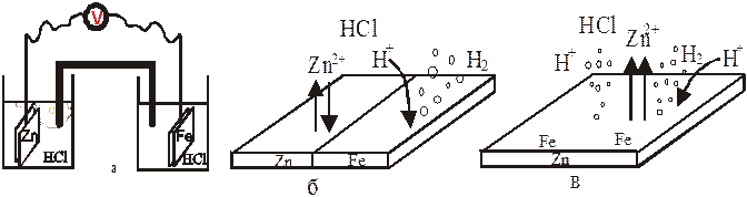 1 ампер за 1 год разрушает: Fe - 9 кг, Zn - 11кг, Pb - 34 кг Виды гальванических элементов: а) макрогальванический, б) короткозамкнутый,