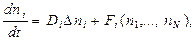 19 Определение диссипативных структур. Примеры. Многообразие форм и путей эволюции материи чрезвычайно велико, основные качественные закономерности процесса самоорганизации зачастую схожи вне зависимости от его конкретной реализации: будь то физика, химия или биология. И могут быть описаны в рамках единых и относительно простых математических моделей. Исследованием таких моделей занимается синергетика – наука о самоорганизации в средах самой различной природы.Самопроизвольный переход от простого к сложному сопровождается повышением упорядоченности и согласованности. К примеру, при определённых условиях в системе, не подверженной внешним пространственно неоднородным воздействиям, из первоначально однородного состояния возникает структура. На языке математики это означает, что пространственно однородное решение некоторой системы нелинейных уравнений теряет устойчивость, а в замен возникает устойчивое пространственно неоднородное решение.Исторически сложилось так, что зарождение структур было впервые описано на примере нелинейной системы диффузионного типа: 20 Модель «Подвижный хищник – подвижная жертва». Основные уравнения. Пространственно однородные решения. Рассмотрим возникновение диссипативной структуры на примере двухкомпонентной диффузионной модели типа «Подвижный хищник – подвижная жертва». Динамика изменения численности жертвы (n1) и хищника (n2) задаётся уравнениями: