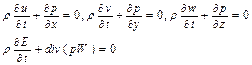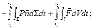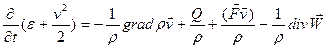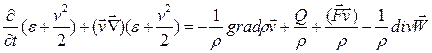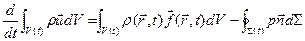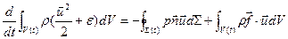 22. Элементы газовой динамики. Понятие сплошной среды Любое тело можно представить в виде совокупности тел, которые можно считать материальными точками. Такая система описывается 6N ДУ с заданными 6N нач. усл.Р/м систему, в которой число частиц конечно; будем характеризовать её 2 параметрами: m – масса, 23. Интегральные законы сохранения 1. закон сохранения массы Будем считать, что для жидкой частицы в отдельности справедлив закон сохранения массы: 2. закон изменения импульса 1-е слагаемое – изменение количества жидкости,2-е слагаемое – результат действия объёмных массовых сил,3-е слагаемое – действие поверхностных сил давления,f – удельная внешняя сила, действующая на жидкой частицы,Замечания: а) жидкость – сплошная средаб) идеальная среда – среда является бездиссипативной, т.е. не учитываем внутреннее трение, теплопроводность, излучение. 3. закон сохранения энергии - если нет ни внешних, ни внутренних сил, тогда полная энергия сохраняется.