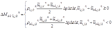 Знак < > означает значение r и u на границе ячейки. Выбор этих величин имеет важное значение, т.к. влияет на устойчивость и точность счета. Используя формулы 1-го порядка точности, учитывая направление потока, имеем: Потоки импульса (энергии) равны произведению DMn на соответствующие значения скорости (полной энергии). Такое описание метода крупных частиц иногда называют методом потоков. Заключительный этап. На этом этапе находят окончательные поля эйлеровых параметров потока в момент tn+1= tn+Dt. Как уже отмечалось, уравнения этого этапа представляют собой законы сохранения массы M, импульса P и полной энергии E, записанные для данной ячейки (крупной частицы) в разностной форме: