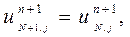 Через открытые границы жидкость может втекать или вытекать из области, и здесь должны быть обеспечены некоторые условия непрерывности движения. Пусть, например, жидкость втекает в прямоугольную область с левой стороны, тогда здесь и задаются параметры набегающего потока. На остальных открытых границах проводится экстраполяция параметров потока изнутри, т.е. в фиктивный слой переносятся значения параметров из ближайшего (к границе) слоя. Рассмотрим случай, когда жидкость вытекает справа из сетки длиной в N ячеек. Наиболее естественно представить вытекающий поток однородным. В простейшем случае условия на слое j в фиктивной ячейке (N+1, j) должны бать такими же, как и в самой ячейке (N, j) (Рис. 1.). Таким образом, в конце эйлерова этапа каждого цикла вычислений полагаем: