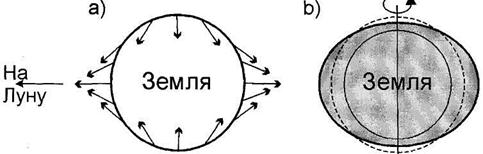 Сила притяжения каждой точки Земли массой Луны всегда направлена по линии, соединяющей данную точку Земли с центром Луны. Таким образом, две силы - сила притяжения массой Луны и центробежная сила от вращения системы Луна - Земля одновременно действуют на каждую точку Земли: одна из них направлена к Луне другая от Луны. Эти две силы в отдельности не уравновешивают друг друга: разность между ними и образует приливообразующую силу Луны на данную точку Земли. Приливообразующие силы показаны на рис. 8.1а. Они вызовут перемещение частиц воды в направлении к меридиану кульминации приливообразующего светила, т. е. определенным образом направленные приливоотливные течения. Под влиянием таких течений водная оболочка Мирового океана принимает вид эллипсоида (8.1Ь).