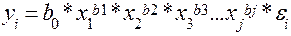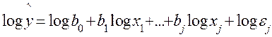 где b0 - нормировочный множитель, b1...bj - неизвестные коэффициенты, ei - случайное отклонение. Используя натуральные логарифмы, можно преобразовать это уравнение в линейную форму: