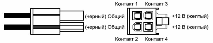 Питание к процессору подается от устройства, называемого модулем регулятора напряжения (VRM), который в настоящее время встраивается в большинство современных системных плат. Этот модуль считывает требуемые параметры потребляемой мощности процессора (обычно через выводы процессора) и соответствующим образом калибрует подаваемое напряжение. Конструкция регулятора напряжения позволяет подавать 5 или 12 В. В системе в основном используется напряжение 5 В, но многие компоненты в настоящее время переходят на 12 В, что связано с их энергопотреблением. Кроме того, напряжение 12 В используется, как правило, приводным электродвигателем, а все другие устройства потребляют напряжение 5 В. Величина напряжения, потребляемого VRM (5 или 12 В), зависит от параметров используемой системной платы или конструкции регулятора. Современные интегральные схемы регуляторов напряжения предназначены для работы при входном напряжении от 4 до 36 В, поэтому их конфигурация всецело зависит от разработчика системной платы. Как правило, в системных платах, предназначенных для процессоров Pentium III и Athlon/Duron, используются 5-вольтные регуляторы напряжения. Несмотря на это, в последнее время возникла тенденция к переходу на регуляторы, потребляющие напряжение 12 В. Это связано с тем, что использование более высокого напряжения позволяет значительно уменьшить текущую нагрузку. Например, если использовать тот же 65-ваттный процессор AMD Athlon с рабочей частотой 1 ГГц, можно получить несколько уровней нагрузки при различных величинах потребляемого напряжения При использовании напряжения 12 В сила потребляемого тока достигает только 5,4 А или, с учетом 75% эффективности регулятора напряжения, 7,2 А. Таким образом, модификация схемы VRM системной платы, позволяющая использовать напряжение 12 В, представляется достаточно простой. К сожалению, стандартный блок питания ATX 2.03 содержит в основном силовом разъеме только один вывод +12 В. Дополнительный разъем вообще не содержит выводов +12 В, поэтому толку от него немного. Подача тока силой 8 А и более на системную плату, осуществляемая при напряжении +12 В через стандартный провод, может привести к повреждению разъема. Для повышения энергообеспечения системных плат в Intel была создана новая спецификация блоков питания ATX12V. Результатом этого стал новый силовой разъем, предназначенный для подачи дополнительного напряжения +12 В на системную плату. Этот силовой разъем показан на рис. 9. Компания PC Power and Cooling выпустила адаптер, позволяющий дополнить стандартный блок питания ATX силовым разъемом ATX12V. Напряжение 12 В генерируется блоком питания и подается к устройству через периферийные разъемы. Адаптер ATX12V показан на рис. 10.