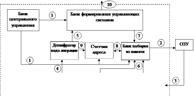 Блок центрального управления генерирует сигнал о начале выполнения очередной команды (связь 1). Ее адрес А находится в счетчике адреса команд. Блок выборки из памяти по сигналу считывает из внутренней памяти (ОЗУ) очередную команду (связь 2), расположенную по адресу А, который выбирается из счетчика адреса команд (связь 8), и помещает ее код на временное хранение в регистр команды (связь 3). Счетчик команд автоматически изменяется так, чтобы в нем содержался адрес следующей команды. Дешифратор кода операции выбирает код (связь 4) и расшифровывает его. Затем передает информацию блоку формирования управляющих сигналов (связь 5): - если операция арифметическая, от блока формирования управляющих сигналов поступает сигнал в блок выборки из памяти (связь 7) с командой «считать из памяти операнды», расположенные по адресам, указанным в регистрах первого и второго операндов (связь 6), и поместить их в соответствующие регистры АЛУ. Затем формируется сигнал в АЛУ на выполнение нужной операции (связь 10). Счетчик адреса команд увеличивается на объем команды (связь 9); - если операция ввода-вывода, блок формирования управляющих сигналов формирует сигнал УВв и УВыв (связь 10). Счетчик адреса увеличивается на объем команды (по связи 9); - если операция условного перехода, блок центрального управления анализирует результат предыдущей операции, находящийся в АЛУ. Если знак результата отрицателен, в счетчик адреса команд записывается адрес из регистра первого операнда. Если знак положителен, в счетчик адреса команд записывается адрес из регистра второго операнда. Если результат равен 0, в счетчик адреса команд добавляется 1 (эти связи не показаны). Так реализуется принцип условного перехода. - если операция безусловного перехода, в счетчик адреса команд пересылается содержимое регистра первого операнда (связь не показана).
