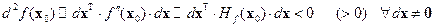Замечания: 1. Каждое из условий и по отдельности, а также оба вместе, являются необходимыми, в то время как только совокупность условий и является достаточным условием. Условие называется необходимым условием I порядка, поскольку функция аппроксимируется многочленом первой степени из разложения Тейлора, условие – необходимым условием II порядка, поскольку функция аппроксимируется многочленом второй степени из разложения Тейлора. 2. Условие означает, что касательная гиперплоскость к графику функции в точке 3. Выполнение условий – еще не означает наличия нестрогого максимума (минимума) – см. пример: 4. Невыполнение условия (при выполнении условий – еще не означает отсутствия строгого экстремума – см. пример: 5. Из условий теоремы видно, что достаточные условия весьма близки к необходимым: они отличаются только строгостью неравенства. Это означает, что данная теорема "почти всегда" дает окончательный ответ о наличии или отсутствии экстремума в рассматриваемой точке. Она не дает ответа лишь в одном случае: если неравенство выполняется существенно как нестрогое, т.е. когда 6. Условие означает неотрицательную (неположительную) определенность матрицы Гессе. Условие означает положительную (отрицательную) определенность матрицы Гессе. Знакоопределенность матрицы Гессе можно установить, пользуясь критерием Сильвестра. 7. Из теоремы вытекает, что если градиент целевой функции равен нулю и ее матрица Гессе отрицательно определена, то имеет место локальный максимум, если положительно определена, – локальный минимум, если не определена (квадратичная форма от дифференциалов знакопеременна), то экстремума нет, если квазиопределена, то ничего сказать нельзя. 8. Из доказательства теоремы видно, что в случае квазиопределенности матрицы Гессе (естественно, при