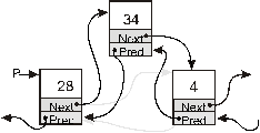 Рис. 9.7. Двусвязный список Очевидно, что значение поля Next последнего элемента и поля Pred первого элемента линейного двусвязного списка равны Nil. Включение нового элемента в двусвязный список и удаление элемента происходит и проще, и сложнее, чем в односвязный. Проще — потому что элемент двусвязного списка содержит указатели и на следующий, и на предыдущий элементы, и нет нужды, как при вставке в односвязный список, либо обменивать информационные поля местами, либо тащить, при проходе по списку, дополнительный указатель на предыдущий элемент. Сложнее — потому что требуется переприсвоить и значения указателей Next, и значения указателей Pred. На рис. 9.8 показана вставка элемента в двусвязный список. Прежние значения указателей показаны светло-серым цветом.