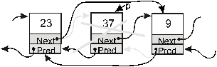 Рис. 9.9. Удаление элемента из двусвязного списка Удаление производится следующими действиями: p^.Pred^.Next:=p^.Next; // связать предыдущий элемент со следующим за p p^.Next^.Pred:=p^.Pred; // связать следующий за p элемент с предыдущим dispose(p) // удаление элемента