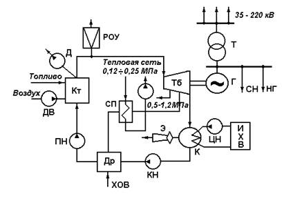 Коммунально-бытовые потребители обычно получают тепловую энергию от сетевых подогревателей (бойлеров) СП. При снижении электрической нагрузки ТЭЦ ниже мощности на тепловом потреблении необходимая для потребителей тепловая энергия может быть получена с помощью редукционно-охладительной установки РОУ, питающейся острым паром котла. Чем больше отбор пара из турбины для теплофикационных нужд, тем меньше тепловой энергии уходит с циркуляционной водой и тем выше КПД электростанции. Следует отметить, что во избежание перегрева хвостовой части турбины через нее должен быть обеспечен во всех режимах пропуск определенного количества пара. Особенности ТЭЦ: 1. Строятся вблизи потребителей тепловой энергии. 2. Обычно работают на привозном топливе. 3. Большую часть вырабатываемой электроэнергии выдают потребителям ближайшего района. 4. Работают по частично вынужденному графику выработки электроэнергии (т.е. график зависит от теплового потребителя). 5. Низкоманеврены (как и КЭС). 6. Имеют более высокий КПД до 60¸70%