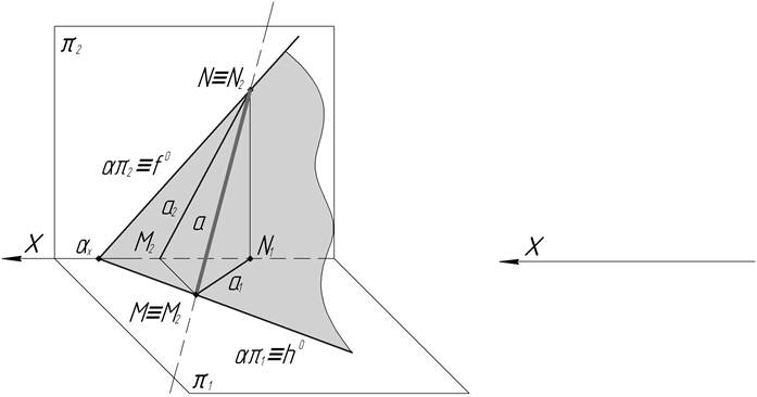 Для того чтобы построить следы плоскости необходимо построить следы прямых, лежащих _ в__ этой плоскости, а затем одноимённые следы соединить прямыми линиями – эти прямые будут _ искомыми следами плоскости _