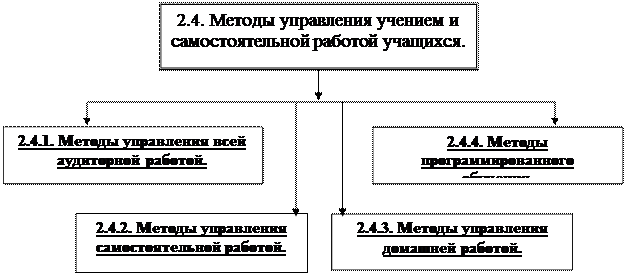 2.4.1. Методы управления всей аудиторной работой при непрерывном участии педагога в развитии мышления, внимания, в контроле за дисциплиной. Подгруппа включает разные методы. 1. Методы подготовки к восприятию учебного материала. В цирке фокусник не готовит зрителей к представлению и не предвещает им зрелищного итога. Лишь увидев фокус, публика изумляется. А в обучении важно получить положительный результат, что бы усвоение произошло на 100%. В этом помогает актуализация опорных знаний, которую проводят перед изучением новой темы. 2. Методы оказания помощи в восприятии, осмыслении, понимании и запоминании учебных сведений. 3. Методы оперативной диагностики. С помощью них возможно быстро выявлять и исправлять недостатки хода аудиторной работы. Назовем некоторые способы: наблюдение и учет, устный опрос, риторические вопросы (такие вопросы, на которые преподаватель не ждет ответа от учащихся, а сам отвечает, замечая реакцию аудитории он оценивает, кто вовлечен в работу, а кто в ней не участвует). 4. Методы коррекции используют обязательно, поскольку не все во время занятия проходит по плану, по конспекту урока и что-нибудь происходит не запланировано. В таких случаях предложены варианты, что бы отреагировать на ситуацию и вернуть ход урока в прежнее русло: - сократить или отбросить второстепенный материал; - ускорить сообщение информации; - переключиться на индуктивную логику изложения материала; Подобные методы должны продумываться педагогом заранее. Лишь очень опытные преподаватели могут сориентироваться прямо на уроке, исправить возможные недостатки и приблизить ход занятия к запланированному, без снижения эффективности. Уместно привести высказывания Ю. Гусмана: «Самая лучшая импровизация – продуманная заранее». 2.4.2. Методы управления самостоятельной работой. Самостоятельной работой учащиеся заняты не только дома, но и в учебном заведении. Это учебная деятельность в лабораторных кабинетах, в мастерских, классе, после инструктажей учащиеся приступают к самостоятельному выполнению заданий. Управлять такой работой можно по-разному, различными методами. 1. Методы устного инструктирования во время вводного, текущего, заключительного инструктажа. Сюда относятся и методы индивидуального и группового инструктирования. 2. Методы письменного инструктирования. Объяснять задания можно с помощью методических указаний к выполнению лабораторных, контрольных и других видов работ, инструкционных карт, инструкционно-технологических карт. 3. Методы инструктирования с помощью технических средств обучения (ТСО) и средств вычислительной техники (ВТ). Так инструктаж может быть снят на видео или быть в анимационном виде. Перед выполнением работ, отработкой трудовых операций инструктаж демонстрируется учащимся. 2.4.3. Методы управления домашней работой. Педагог не участвует в выполнении работы учащимися, но в процессе выдачи осуществляется их взаимодействие с помощью следующих методов. 1. Методы выдачи домашнего задания (устные и письменные). 2. Методы заочного консультирования в виде методических рекомендаций по выполнению домашних заданий или методические издания под названием «Типичные ошибки при выполнении домашних работ». 2.4.4. Методы программированного обучения. Использование этих методов подразумевает, что обучаемые не контактиру