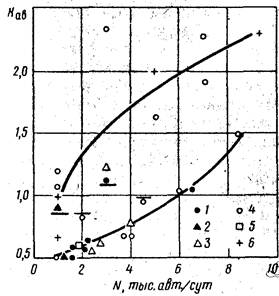 Количество происшествий в населенных пунктах увеличивается при росте интенсивности движения и тем выше, чем больше плотность застройки. На рисунок 4.26 сопоставлены количества происшествий в населенных пунктах сельского типа и на примыкающих к ним участках дорог. За единицу сравнения было принято количество происшествий вне населенных пунктов при интенсивности 6000 авт./сут, близкой к предельной нормальной загрузке дорог с 7-метровой проезжей частью. Для ряда дорог имеется практически постоянное соотношение 2,5 - 2,7 в населенных пунктах и на перегонах. Близкую величину 3,1 получил канд. техн. наук А. П. Матросов для дорог Ростовской области. Научно-исследовательский институт автомобильного транспорта определил это соотношение для населенных пунктов и небольших заводских поселков в 10, а проф., д-р техн. наук Я. В. Хомяк и канд. техн. наук В. В. Полищук для условий Украины - в 8-10 раз. Зарубежная статистика указывает, что в ФРГ число происшествий возрастает в населенных пунктах в зависимости от их размера и особенностей планировки в 1,2 - 7,5 раза. Разброс цифр связан не только с особенностями планировки населенных пунктов, удалением строений от дороги, наличием тротуаров, но и с дисциплинированностью пешеходов. Особенно велико влияние на безопасность движения наличие тротуаров. Соотношение количества смертельных исходов от наездов на пешеходов составляет: