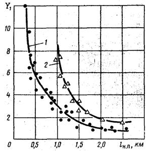 Рисунок 4.27. Зависимость числа дорожно-транспортных происшествий на 1 млн авт-км от протяженности населенного пункта: 1 - при наличии стоянок в местах сосредоточения автомобилей; 2 - при отсутствии стоянок