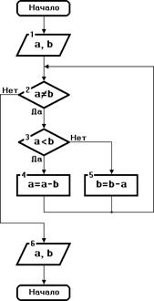 Словесная запись: 1. Задать два числа. 2. Если числа равны, то взять первое из них в качестве ответа и прекратить выполнение алгоритма, иначе идти к пункту 3. 3. Определить бóльшее из двух чисел. 4. Заменить бóльшее число на разность между бóльшим и меньшим числами. 5. Идти к пункту 2.