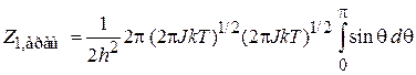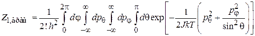 Молекула массой m состоит из двух одинаковых атомов, находящихся на расстоянии 2 r и вращающихся вокруг центра масс при температуре Т. Найти статистический интеграл вращений. При вращении изменяется угловое положение атомов. Используем сферические координаты с центром в точке симметрии молекулы. На рисунке черный круг – атом, второй атом в симметричной точке не показан.
