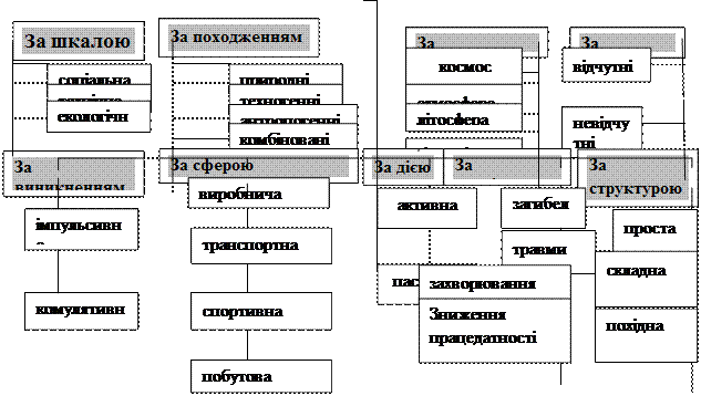 ЛЕКЦІЯ 2. ТАКСОНОМІЯ, ІНДЕНТИФІКАЦІЯ ТА КВАНТИФІКАЦІЯ Потенційна небезпека стає реальною за умови безпосереднього впливу на об’єкт. Кожна складова довкілля може бути об’єктом,який слід захищати від небезпеки. До об’єктів належать: людина, суспільство, держава, біосфера, техносфера тощо. На планеті залишилось обмаль територій з непорушеними екосистемами. Найбільше вони зруйновані в розвинених країнах – в Європі, Східній Америці, Японії. Так, площа непорушеної території на європейській частині континенту складає лише 15,6 % і є невеликими цятками біосфери, оточеними з усіх сторін територіями, які жорстко експлуатуються людиною[ 2]. Таким чином, більшість населення планети мешкають у техносфері, де умови проживання значно відрізняються від біосферних. У зв’язку з цим, останнім часом активно розвивається вчення про безпеку життєдіяльності людини в техносфері. Основна його ціль – захист людини від негативного впливу антропогенного та природного походження. Засобом досягнення цієї мети є оволодіння та реалізація суспільством знань та умінь, що спрямовані на зменшення фізичних, хімічних, біологічних та інших негативних впливів на людину та довкілля. Таксономія небезпек – це класифікація та систематизування явищ, процесів, об’єктів, які здатні завдати шкоди людині [ 9 ]. Приклад таксономії небезпек подано на рис.2.1. Небезпеки класифікують таким чином: 1.За природним походженням (природні, техногенні, антропогенні та комбіновані). 2.За часом проявлення (імпульсні, кумулятивні). 3.За локалізацією (космос, атмосфера, літосфера, гідросфера). 4.За наслідками (захворювання, травми, загибель, пожежі). 5.За шкодою (соціальні, технічні, екологічні). 6.За сферою виявлення (побутові, спортивні, дорожно – транспортні, виробничі). 7.За структурою (прості, складні, похідні). 8.За характером дії на людину (активні та пасивні). 9.За здатністю людини (відчутні, невідчутні). Практика дає людині всі підстави для висування аксіоми, що будь – яка діяльність людини є потенційно небезпечною. Потенційна життєдіяльність людини існує як явно, так і приховано у формі виявів її результатів, котрі важко передбачити і які можуть спричинити травми, загибель, захворювання, погіршення працездатності, самопочуття та інші небажані наслідки. Небезпека – це наслідок дії окремих чинників на людину. Розрізняють уражаючі, небезпечні та шкідливі чинники. Уражаючі чинники можуть призвести до загибелі людини. Небезпечні чинники викликають за певних умов травми чи раптове погіршення здоров’я (головний біль, погіршення зору, слуху, зміни психологічного й фізичного стану та ін.) Шкідливі чинники можуть викликати захворювання чи зниження працездатності людини як у явній, так і в прихованій формі. Розподіл чинників на уражаючі, небезпечні та шкідливі досить умовний. Один і той самий чинник може спричинити загибель людини, травму, захворювання чи не завдати ніякої шкоди через здатність її організму до протидії (електричний струм, радіація та ін.). У кожному конкретному випадку виникнення небезпеки в технічній системі має багато причинний характер, її розвиток відбувається через низку подій. Варіанти причин та наступні дії можна передбачити за умови створення системи, аналізу її структури, дій оператора під час обслуговування або ж управління технічною системою. Наявність потен