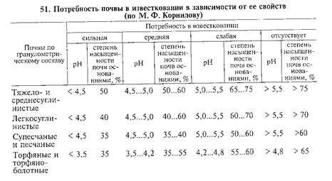 Определение потребности почв в известковании и вычисление доз известиПотребность почвы в известковаi4ии определяют, учитывая следующие показатели: рН соленой вытяжки, степень насыщенности основаниями, гранулометрический состав, чувствительность возделываемых растений к кислотности. Впервом приближении потребность почв в известковании можно установить по рН солевой вытяжки (КСI), руководствуясь следующими данными: • при рН < 4,5 почва сильно нуждается в известковании • при рИ 4,5.5,0 почва средне нуждается в известковании • при рН 5,1.5,5 почва слабо нуждается в известковании • при рН > 5,5 почва не нуждается в известковании. При определении потребности в известковании минеральных и торфяных почв учитывают их рН, степень насыщенности основаниями и гранулометрический состав (табл.).