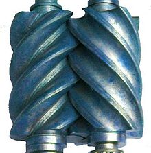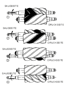 На рисунке показаны последовательные положения одних и тех же канавок, заполненных жидкостью. Слева – сторона всасывания, справа – нагнетания. Винтовые насосы применяют для перекачивания жидкостей различной вязкости при давлениях до 30 МПа. Наиболее распространёнными являются трёхвинтовые насосы. Центральный ведущий винт берет на себя всю нагрузку по перекачке жидкости. Два других ведомых винта совместно с центральным приводом образуют отделенные друг от друга полости между нарезками и обоймой, в которые поступает жидкость. Это обеспечивает постепенное нарастание давления. Поскольку весь процесс подачи жидкости обеспечивается работой центрального винта, крутящий момент, передаваемый на ведомые роторы, расходуется только на преодоление сопротивления вязкой среды при передвижении в канале.