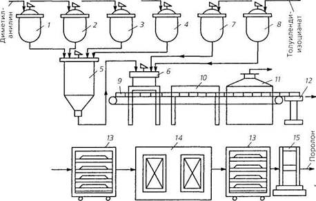 Активаторную смесь готовят в смесителе 5, в который загружают из сборника 1 катализатор - диметиланилии, из сборника 2 парафиновое масло, регулирующее размер пор, из сборника 3 натриевые соли сульфокислот и из сборника 4 воду. После тщательного перемешивания активаторную смесь непрерывно подают в смесительную головку 6 установки (туда же вводят ПЭФ и ТДИ из сборников 7 и 8), где в течение 1-2 мин создается однородная композиция, сливаемая затем па непрерывно движущуюся бумажную форму 9, которая установлена па транспортере. В форме композиция вспенивается выделяющимся углекислым газом. Форма после прохождения тоннеля для вспенивания 10 поступает в сушильную камеру 11 а затем в машину 12 для нарезки блоков заданных размеров. Блоки укладываются на этажерки 13 и передаются в камеру 14 для отверждения при обдувке воздухом в течение 1-3 сут. Готовые блоки режутся па листы определенной толщины па резательном станке 15 и упаковываются. Эластичный ППУ выпускают в виде блоков длиной не менее 1200 мм, шириной не менее 400 мм и толщиной до 100мм, листов длиной 2000 мм, шириной 1000 мм и толщиной от 4 до 300 мм, полотен длиной не менее 15 000 мм, шириной 850-1500 мм и толщиной от 3 до 400 мм. Поролон применяют в качестве амортизационного, набивочного и настилочного материала в автомобиле-, вагоно- и самолетостроении, а так же при изготовлении мягкой мебели.