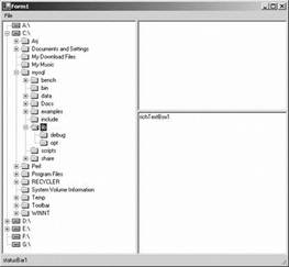 Рис. 14. Подключили список изображений к дереву Теперь для отображения значков в узлах дерева нам необходимо изменить исходный текст методов DriveTreeInit и GetDirs. Напомним, что первый из этих методов инициализирует дерево, а второй — добавляет к узлу дерева список каталогов. Обратите внимание на конструктор класса TreeNode, создающий узлы дерева внутри тела цикла foreach: public void DriveTreeInit() Этот конструктор имеет три параметра. Про первый параметр мы уже рассказывали — он задает текст надписи для узла дерева. Теперь настало время рассказать и про два остальных параметра. Если к элементу управления TreeView подключен список изображений, то второй и третий параметры конструктора класса TreeNode задают индексы изображений для узла дерева. При этом второй параметр определяет изображение невыделенного узла дерева, а третий — выделенного. Что касается метода DriveTreeInit, то расположенный в нем конструктор создает узлы, отображающий только дисковые устройства. В любом состоянии (как выделенном, так и невыделенном) нам необходимо отображать один и тот же значок дискового устройства, имеющий в нашем случае индекс 0. Поэтому второй и третий параметры конструктора передают нулевые значения. Другое дело — метод GetDirs: public void GetDirs(TreeNode node) Здесь конструктору класса TreeNode, размещенному внутри оператора цикла foreach, через второй и третий параметры мы передаем индексы значков закрытой и открытой папки, соответственно. В результате при отображении дерева папки, которые выделил пользователь, выделяются своим обозначением (рис. 15).