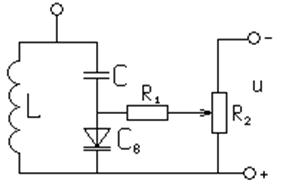 Регулировкой напряжения смещения, подаваемого на диод с потенциометра R2 через резистор R1, можно изменять емкость диода и, следовательно, резонансную частоту колебательного контура. Резистор R1 предотвращает возможность шунтирования колебательного контура при перемещении движка потенциометра. Сопротивление резистора R1 выбирают большим резонансного сопротивления контура.