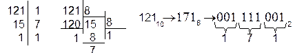 Использование промежуточной системы счисления Этот метод применяют при переводе из десятичной системы счисления в двоичную и наоборот. В качестве промежуточной системы счисления чаще всего используют системы по основанию 2k. A=12110®?8®?2