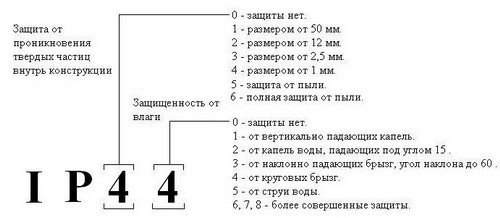 Светильнику, классифицированному по системе IP, присваивается маркировка, состоящая из букв IP и двух цифр. Первая цифра обозначает уровень защиты от твердых частиц, вторая - от влаги. Например, если светильник маркирован IP20, это означает, что он имеет 2 уровень защиты от твердых частиц и 0 от жидкости. Иногда при составлении требований к светильнику используется обозначение типа IPx3. Это означает, что уровень защиты светильника от твердых частиц не имеет значения, а уровень защиты от влаги должен быть не менее 3.