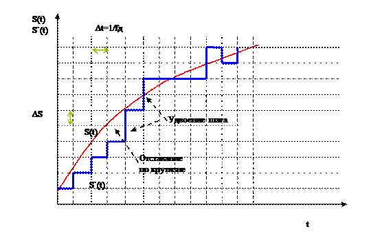 Работает она следующим образом. Сигнал S(t) и его предсказанное значение S`(t) поступает на стробируемый вычитатель, на выходе которого формируется выборки разности ΔSk с частотой fд. Знак разности кодируется одноразрядным кодером. По знаку разности предсказатель (в этой схеме это интегратор) накапливает результат, формируя S`(t) по ступенькам ΔS с учетом знака. Восстановление сигнала идет также с помощью интегратора. Фильтр низкой частоты (ФНЧ) на конечном этапе сглаживает сигнал. Преимущества. - Простота кодека (кодера и декодера). - Сохранение полосы частот таким же, как и при ИКМ, несмотря на большую частоту дискретизации fд; в ИКМ 8-разрядный код, а здесь одноразрядный. Недостатки. Предсказанное значение сигнала S`(t) ступенчатая функция с постоянным шагом ΔS и она может отставать или опережать от S(t), возникает так называемая перегрузка по крутизне. Это специфические искажения по крутизне, рис. 26. Для уменьшения их до приемлемой величины необходимо выполнить условие
