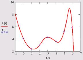 Более сложный тип интерполяции — так называемая интерполяция В-сплай-нами. В отличие от обычной сплайн-интерполяции, сшивка элементарных В-сплайнов производится не в точках хi а в других точках ui, координаты которых предлагается ввести пользователю. Сплайны могут быть полиномами 1, 2 или 3 степени (линейные, квадратичные или кубические). Применяется интерполяция В-сплайнами точно так же, как и обычная сплайн-интерполяция, различие состоит только в определении вспомогательной функции коэффициентов сплайна. o interp(s,x,y, t) — функция, аппроксимирующая данные векторов х и у с помощью В-сплайнов; o bspline(x,y,u,n) — вектор значений коэффициентов В-сплайна; o s — вектор вторых производных, созданный функцией bspline; o х — вектор действительных данных аргумента, элементы которого расположены в порядке возрастания; o у — вектор действительных данных значений того же размера; o t — значение аргумента, при котором вычисляется интерполирующая функция; o u — вектор значений аргумента, в которых производится сшивка В-сплайнов; o n — порядок полиномов сплайновой интерполяции (1, 2 или 3). Размерность вектора и должна быть на 1, 2 или з меньше размерности векторов х и у. Первый элемент вектора и должен быть меньше или равен первому элементу вектора х, а последний элемент и — больше или равен последнему элементу х.
