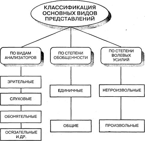 В настоящее время существует несколько подходов к построению классификации представлений. Поскольку в основе представлений лежит прошлый перцептивный опыт, то основная классификация представлений строится на основе классификации видов ощущения и восприятия. Поэтому принято выделять следующие виды представлений: зрительные, слуховые, двигательные (кинестетические), осязательные, обонятельные, вкусовые, температурные и органические. Следует отметить, что данный подход к классификации представлений не может рассматриваться как единственный. Так, Б. М. Теплов говорил, что классификацию представлений можно осуществить по следующим признакам: 1) по их содержанию; с этой точки зрения можно говорить о представлениях математических, географических, технических, музыкальных и т. д.; 2) по степени обобщенности; с этой точки зрения можно говорить о частных и общих представлениях. Кроме этого, классификацию представлений можно осуществить по степени проявления волевых усилий: на непроизвольные и произвольные представления. Зрительные представления. Характерной особенностью зрительных представлений является то, что в отдельных случаях они бывают предельно конкретными и передают все видимые качества предметов: цвет, форму, объем. Однако чаще всего в зрительных представлениях преобладает какая-нибудь одна сторона, а другие или очень неясны или отсутствуют вовсе.