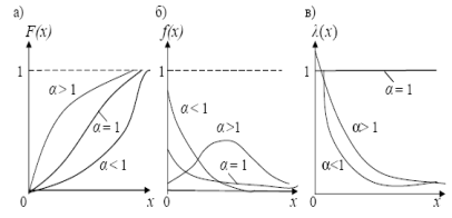 Рис. 2.7. Функция (а), плотность (б) и интенсивность (в) распределения Вейбулла Правила пользования этими формулами можно уяснить на примере. Данные для расчета следующие: