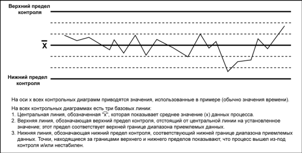 Контрольная диаграмма позволяет визуализировать изменение какой-либо контрольной величины во времени. Она представляет собой график зависимости этой величины от времени. Данные для его построения могут быть взяты, например, из контрольных листков. После его построения можно выявить, в какой период произошло что-то, что повлияло на эту величину, и определить, что это было. Например: износ оборудования, изменение субподрядчика, применение другого материала, набор новых сотрудников и т.д.