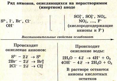 Суммируя, можно сказать, что в процессе электролиза раствора электролита на электродах всегда могут происходить следующие процессы: 1) На аноде — окисление аниона, входящего в состав электролита; — окисление гидроксид-ионов из воды до кислорода; — растворение материала анода (если он не инертный) 2) На катоде — восстановление катиона, входящего в состав электролита; — восстановление катионов водорода из воды до водорода.