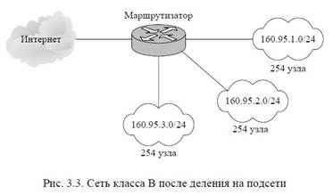 В такой сети может находиться до 65534 узлов. Однако организации требуется 3 независимые сети с числом узлов в каждой не более 254. В этой ситуации можно применить деление на подсети с помощью масок. Например, при использовании маски 255.255.255.0 третий байт адреса будет определять номер внутренней подсети, а четвертый байт – номер узла (см. рис. 3.3).
