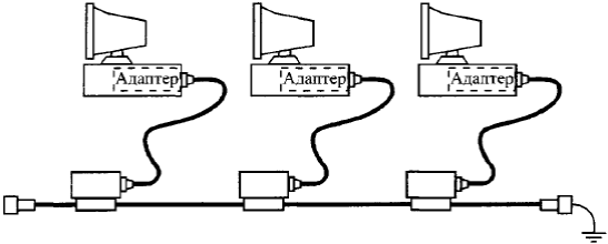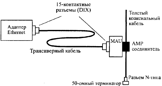 Рис. 9.4 - Оборудование 10Base5 Для соединения отрезков толстого коаксиального кабеля между собой, а также терминаторов с таким кабелем используются разъемы N-типа. Два разъема N-типа для увеличения длины кабеля могут соединяться с помощью Barrel-коннекторов. На обоих концах кабеля сегмента должны быть установлены терминаторы N-типа. Один из них необходимо заземлить. Для присоединения сетевых адаптеров к толстому коаксиальному кабелю служат трансиверы (рис.9.5).