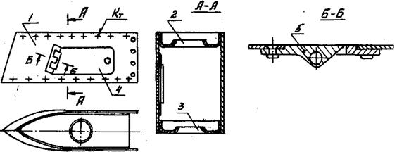 Рис.52. В корпус держателя запрессовывают втулки под крепление его к ЛА. На рис.52б приведён фрагмент крепления боковой панели (4) держателя БД4 к литому корпусу (3). Предварительно в корпус держателя вставляют вкладыши (1), с самоконтрящей гайкой (2), и винтами (5) крепят к нему панель. Устанавливают и крепят на корпусе передний и задний обтекатели. Обтекатели поступают на сборку с установленными на них агрегатами МВН И МПИ. Устанавливают ЗСУ, передний и задний узлы подвески, ухваты.
