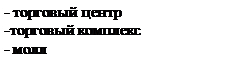 Торговый комплекс: совокупность торговых предприятий, реализующих универсальный ассортимент товаров и оказывающих широкий набор услуг, а также централизовавших функции хозяйственного обслуживания торговой деятельности (электроосвещение, тепло- и водоснабжение, канализация, средства связи, ремонт зданий, сооружений и оборудования, уборка мусора, охрана торговых объектов, организация питания служащих и т.п. Московское правительство понятие торгового комплекса более конкретизировало: он включает 10-80 тыс. кв.м. Торговый центр – совокупность торговых предприятий, реализующих универсальный ассортимент товаров и услуг, расположенных на определенной территории, спланированных, построенных и управляемых как единое целое и представляющих в границах своей территории стоянку для автомашин. В соответствии с вышеуказанными определениями торговые кооперации классифицируют по месту расположению и концентрации (см. рис.7.). Для торговых объединений месторасположение не имеет значения. Торговые предприятия, входящие в торговое объединения могут располагаться в разных районах, городах и даже странах. Торговые объединения являются формой сотрудничества для централизации функций торговых предприятий. В торговый комплекс и торговый центр объединены предприятия, расположенные только на близлежащей территории, для них концентрация в одном месте имеет важное значение.