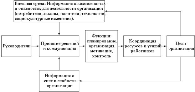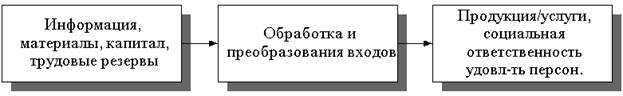Рис. 1Функции управления. ПЛАНИРОВАНИЕ. Функция планирования предполагает решение о том, какими должны быть цели организации и что должны делать члены организации, чтобы достичь этих целей. По сути своей, функция планирования отвечает на три следующих основных вопроса: 1. Где мы находимся в настоящее время? Руководители должны оценивать сильные и слабые стороны организации в таких важных областях как финансы, маркетинг, производство, научные исследования и разработки, трудовые ресурсы. Все это осуществляется с целью определить, чего может реально добиться организация. 2. Куда мы хотим двигаться? Оценивая возможности и угрозы в окружающей организацию среде, такие как конкуренция, клиенты, законы, политические факторы, экономические условия, технология, снабжение, социальные и культурные изменения, руководство определяет, каким и должны быть цели организации и что может помешать организации достичь этих целей. 3. Как мы собираемся сделать это? Руководители должны решить как в общих чертах, так и конкретно, что должны делать члены организации, чтобы достичь выполнения целей организации. 5.2. Системный подход Теория систем впервые была применена в точных науках. Системный подход- это не есть набор каких-то руководств или принципов для управляющих-это способ мышления, по отношению к организации и управлению. Чтобы осознать, как системный подход помогает руководителю лучше понять организацию и более эффективно достичь целей, давайте сначала определим, что такое система. СИСТЕМА - это некоторая целостность, состоящая из взаимозависимых частей, каждая из которых вносит свой вклад в характеристики целого. Ее части взаимозависимы. Если одна из них будет отсутствовать или неправильно функционировать, то и вся система будет функционировать неправильно. Все организации являются системами. Поскольку люди являются, в общем смысле, компонентами организаций (социальные компоненты), они называются социотехническими системами. Существует два основных типа систем: закрытые и открытые. Закрытая система имеет жесткие фиксированные границы, ее действия относительно независимы от среды, окружающей систему. Часы - знакомый пример закрытой системы. Взаимозависимые части часов двигаются непрерывно и очень точно, как только часы заведены или поставлена батарейка. И пока в часах имеется источник накопленной энергии, их система независима от окружающей среды. Открытая система характеризуется тем, что ее функционирование полностью обусловлено воздействием внешних факторов. Любая организация это открытая система. Рис. 2. представляет собой упрощенное изображение организации как открытой системы. На входе организация получает от окружающей среды информацию, капитал, человеческие ресурсы и материалы. Эти компоненты называются входами. В процессе преобразования организация обрабатывает эти входы, преобразуя их в продукцию или услуги. Эта продукция и услуги являются выходами организации, которые она выносит в окружающую среду.