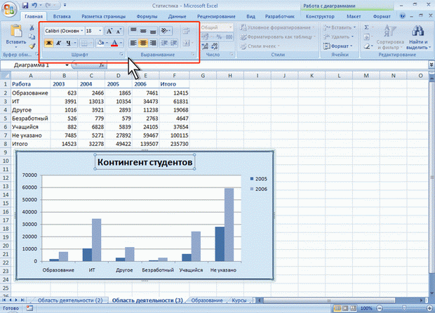 Установите требуемые параметры с использованием элементов групп Шрифт и Выравнивание вкладки Главная (рис. 14.35).