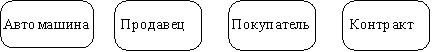 Рис. 10. Графическое изображение сущности Каждая сущность должна обладать уникальным идентификатором. Каждый экземпляр сущности должен однозначно идентифицироваться и отличаться от всех других экземпляров данного типа сущности. Каждая сущность должна обладать некоторыми свойствами: · каждая сущность должна иметь уникальное имя, и к одному и тому же имени должна всегда применяться одна и та же интерпретация. Одна и та же интерпретация не может применяться к различным именам, если только они не являются псевдонимами; · сущность обладает одним или несколькими атрибутами, которые либо принадлежат сущности, либо наследуются через связь; · сущность обладает одним или несколькими атрибутами, которые однозначно идентифицируют каждый экземпляр сущности; · каждая сущность может обладать любым количеством связей с другими сущностями модели. Обращаясь к приведенным выше выдержкам из интервью, видно, что сущности, которые могут быть идентифицированы с главным менеджером - это автомашины и продавцы. Продавцу важны автомашины и связанные с их продажей данные. Для администратора важны покупатели, автомашины, продавцы и контракты. Исходя из этого, выделяются четыре сущности (автомашина, продавец, покупатель, контракт), которые изображаются на диаграмме следующим образом (рис. 11).