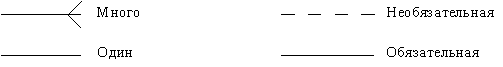 Рис. 11 Связь (Relationship) - поименованная ассоциация между двумя сущностями, значимая для рассматриваемой предметной области. Связь - это ассоциация между сущностями, при которой, как правило, каждый экземпляр одной сущности, называемой родительской сущностью, ассоциирован с произвольным (в том числе нулевым) количеством экземпляров второй сущности, называемой сущностью - потомком, а каждый экземпляр сущности - потомка ассоциирован в точности с одним экземпляром сущности - родителя. Таким образом, экземпляр сущности-потомка может существовать только при существовании сущности родителя. Связи может даваться имя, выражаемое грамматическим оборотом глагола и помещаемое возле линии связи. Имя каждой связи между двумя данными сущностями должно быть уникальным, но имена связей в модели не обязаны быть уникальными. Имя связи всегда формируется с точки зрения родителя, так что предложение может быть образовано соединением имени сущности-родителя, имени связи, выражения степени и имени сущности-потомка. Например, связь продавца с контрактом может быть выражена следующим образом: · продавец может получить вознаграждение за один или более контрактов; · контракт должен быть инициирован ровно одним продавцом. Степень связи и обязательность графически изображаются следующим образом (рис. 12).