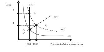 MD – спрос на деньги MS – предложение денег E – точки равновесия M – денежная масса