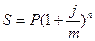 S – наращенная сумма; P – первоначальная сумма; j – номинальная годовая ставка, %; m – число раз начисления процентов в год; n – количество периодов наращения.