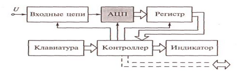 Рассмотрим устройство и некоторые особенности представителей довольно распространенного семейства ЦИП — цифровых вольтметров (ЦВ) и мультиметров (ЦМ). УЭ 5.3-1. Структура цифрового вольтметра (ЦВ) Упрощенная структура показана на рисунке 5.14. На вход прибора подается измеряемое напряжение U (постоянное или переменное, в частности, периодическое).
