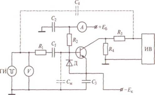 На рисунке 7.8 изображена схема для измерения времени рассасывания быстродействующих транзисторов. Испытуемый транзистор насыщен постоянным базовым током. Насыщающий ток Iб1 обеспечивается генератором тока, образованным источником 2% и резистором R2. Генератор импульсов тока (ГИ) вырабатывает импульсы напряжения прямоугольной формы длительностью tи. Амплитуда импульсного напряжения должна быть, по крайней мере, в 10 раз больше максимально возможного значения Uб нас транзистора. В этих условиях рассасывающий ток определяется из соотношения Iб2 = где U — амплитудное значение импульса, измеряемое вольтметром V; R1— сопротивление. Значение тока Iб контролируется амперметром постоянного тока А. Для обеспечения минимальной погрешности измерения, как правило, берутIб1 =Iб2. Вспомогательный диод Д предназначен для защиты от пробоя эмиттерного перехода транзистора после окончания процесса рассасывания. В течение всего измеряемого отрезка времени вспомогательный диод заперт. Поэтому нет особых требований к его времени восстановления. Однако диод несколько искажает форму импульса тока базы из-за зарядной емкости, шунтирующей входные зажимы транзистора. Для быстродействующих транзисторов вспомогательный диод можно не ставить. В тех случаях, когда вспомогательный диод необходим, диод выбирают с минимальной емкостью при запирающем напряжении порядка 1 В. Емкость диода, как и паразитная емкость монтажа от зажима базы на «землю», снижает качество генератора импульсного тока.