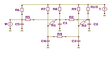 Рис. 3. Здесь Сп - теплоемкость участка плиты, которая считается сосредоточенной в центре участка, R1-R4 -теплопроводности между участками платы, R5- теплопроводность между нагревателем и платой, R6-R10 - конвекционные теплопроводности, Т- источник температуры, равный теппературе окружающей Среды, Ф=Р -источник теплового потока, определяемый мощностью нагревателя. Топологические уравнения - тепловая подсистема. а ) уравнение равновесия б) уравнение непрерывности