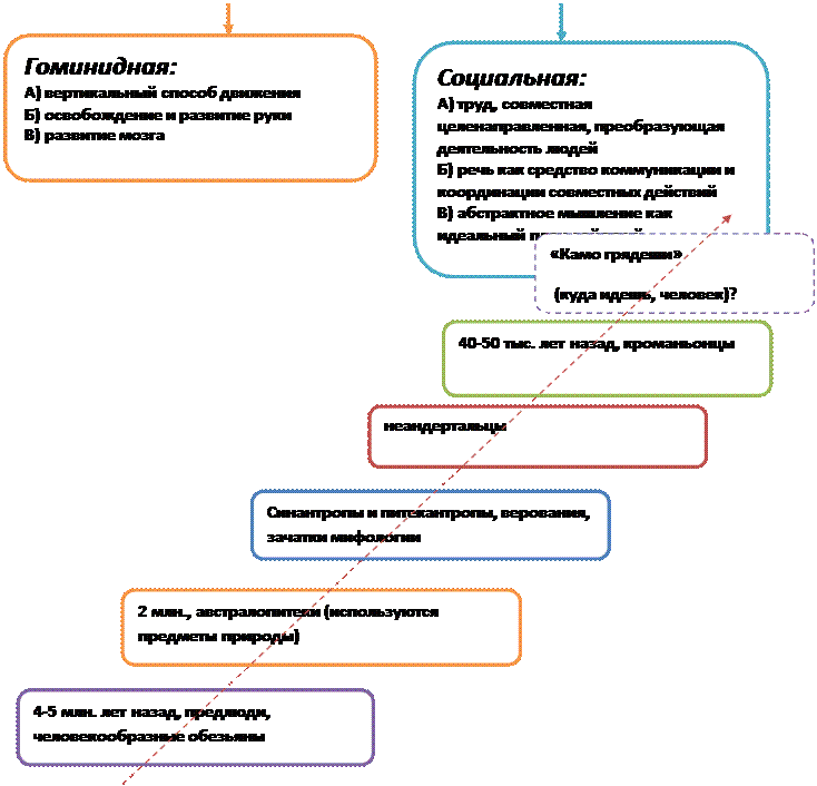 Процесс становления человека – это трансформация антропогенеза (при котором определяющими в жизнедеятельности человека были природно-биологические факторы) в социогенез (т.е. человек начинает развиваться уже на основе социальной деятельности и социальных отношений)