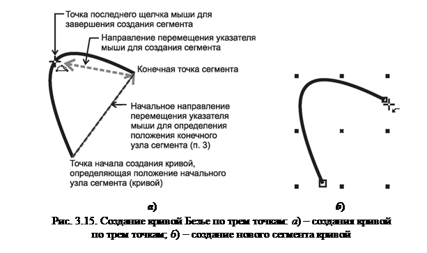 Как и в случае с инструментом Freehand (Свободная форма), завершение создания очередного (или единственного) сегмента кривой автоматически завершает создание кривой – вокруг сегмента (кривой) появляются маркеры выделения объекта, как показано на рис. 3.15, б. Чтобы продолжить построение следующего сегмента кривой, подведите указатель мыши к конечному узлу уже созданного сегмента так, чтобы указатель изменил свой вид, как показано на рис. 3.15, б, и только тогда начинайте построение следующего сегмента.