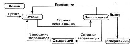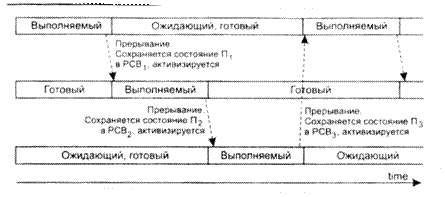 Процесс - это программный модуль, выполняемый в центральном процессоре (CPU). Операционная система контролирует следующую деятельность, связанную с процессами: • создание и удаление процессов; • планирование процессов; • синхронизация процессов; • коммуникация процессов; • разрешение тупиковых ситуаций. Не следует смешивать понятия процесс и программа. Программа — это план действий, а процесс — это само действие, поэтому понятие процесса включает: • программный код; • данные; • содержимое стека; • содержимое адресного и других регистров процессора. Таким образом, для одной программы могут быть созданы несколько процессов в том случае, если с помощью одной программы в CPU выполняется несколько несовпадающих последовательностей команд. За время существования процесс многократно изменяет свое состояние. Различают следующие состояния процесса (рис. 1.9): • новый (процесс только что создан); • выполняемый (команды программы выполняются в CPU); • ожидающий (процесс ожидает завершения некоторого события, чаще всего операции ввода-вывода); • готовый (процесс ожидает освобождения CPU); • завершенный (процесс завершил свою работу). Переход из одного состояния в другое не может выполняться произвольным образом. На рис. 1.9 приведена типовая диаграмма переходов для состояний процессов. Каждый процесс представлен в операционной системе набором данных, называемых таблица управления процессом (ТУП — PCB — process control block). В PCB процесс описывается набором значений, параметров, характеризующих его текущее состояние и используемых операционной системой для управления прохождением процесса через компьютер. На рис. 1.10 схематически показано, каким образом операционная система использует PCB для переключения процессора с одного процесса на другой.